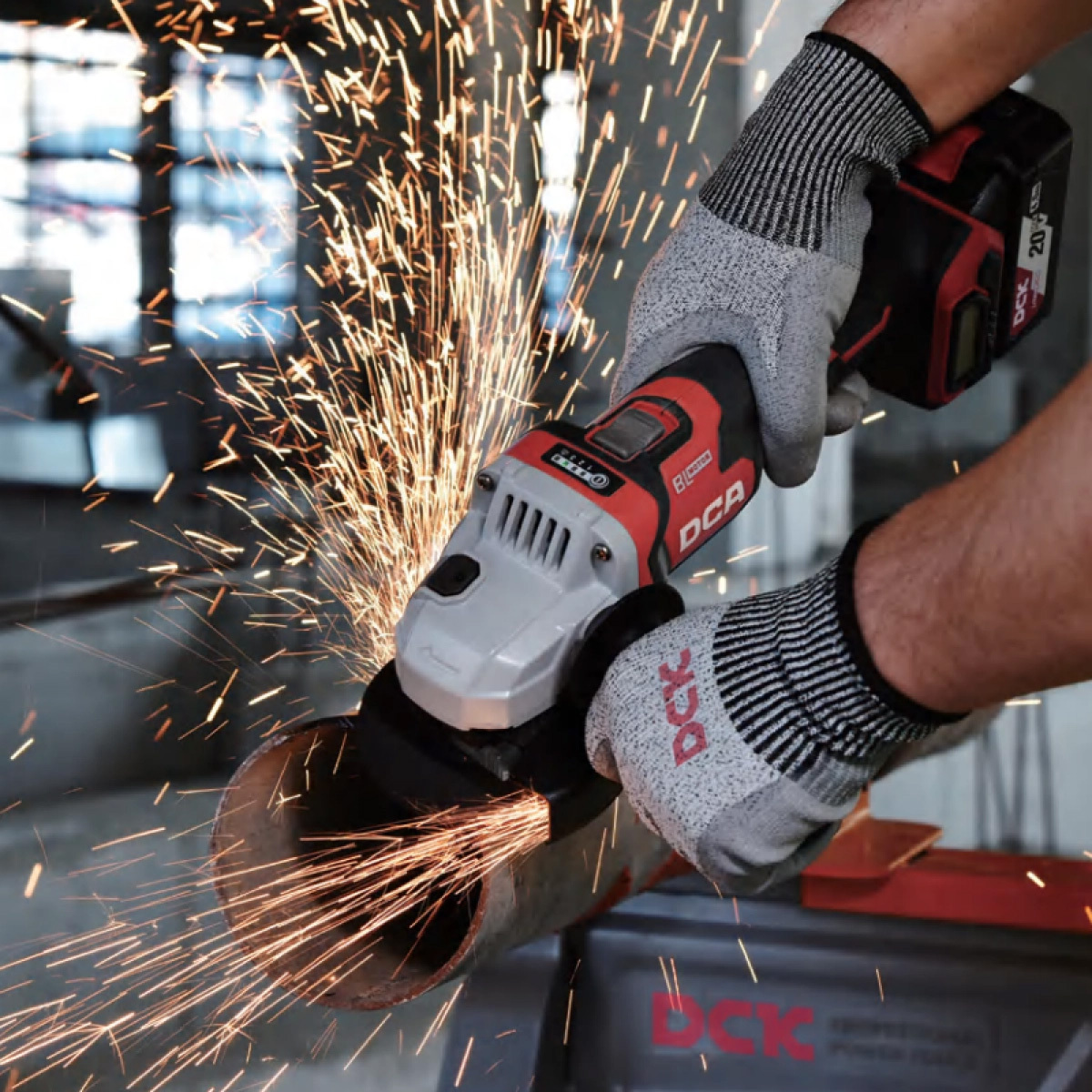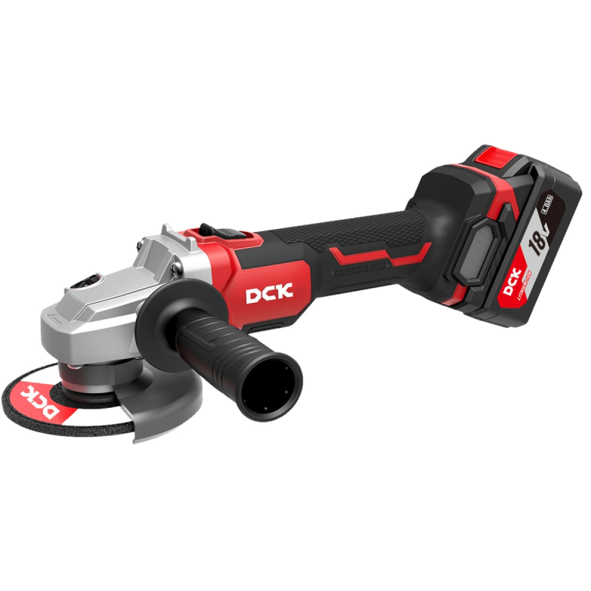 Аккумуляторная Угловая Шлифовальная Машина (УШМ) DCK KDSM03-125, она же болгарка,  предназначена для резки и шлифовки различных материалов, таких как метал или плитка, с использованием специализированных отрезных или алмазных дисков. Работает с дисками популярного размера 125 мм с посадкой 22,5 мм, питается от аккумуляторов напряжением 18 В.
