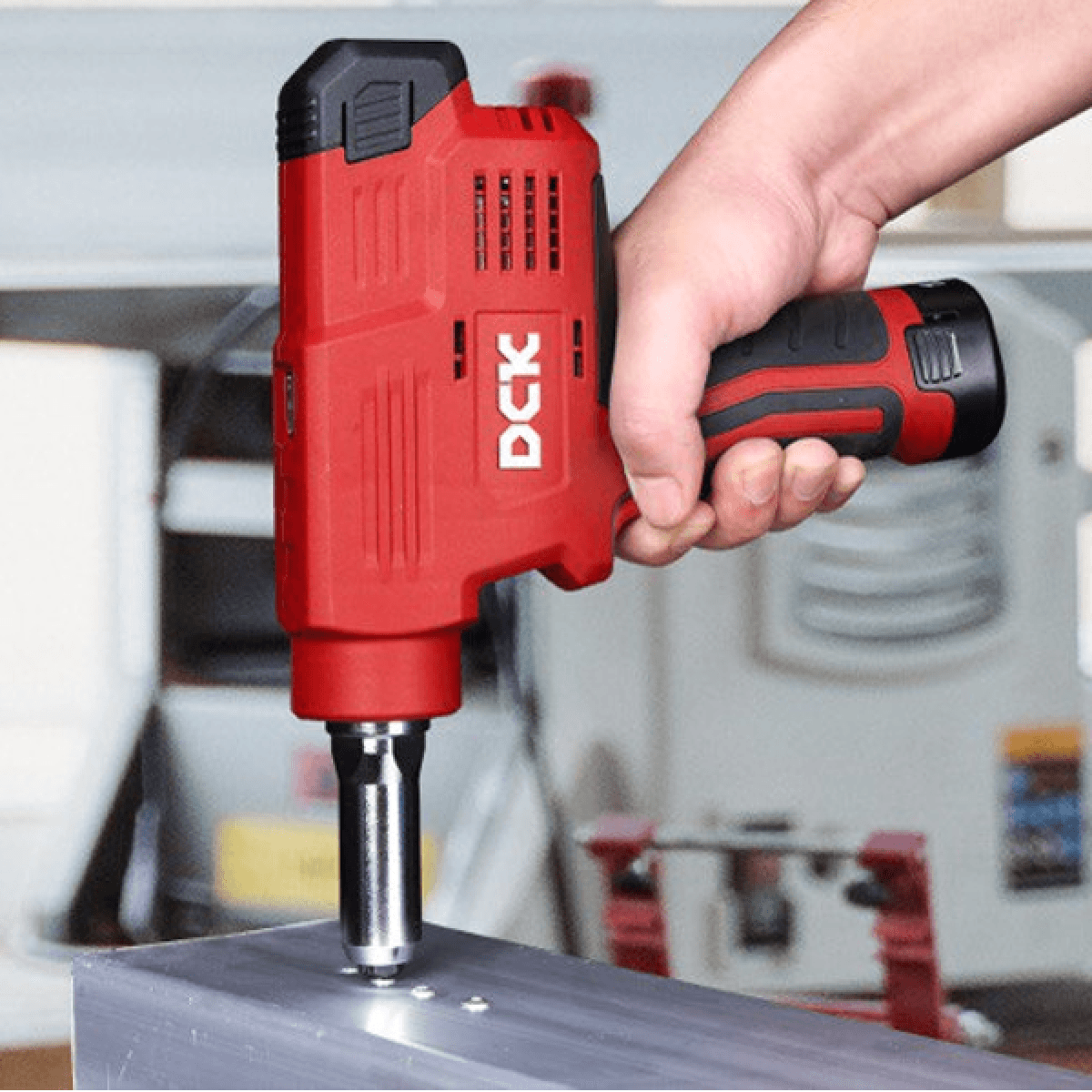 Аккумуляторный заклепочник DCK KDPM50 - значительно упрощает и ускоряет установку вытяжных заклепок. Работает с компантными аккумуляторами с напряжением 10.8 В. Обладая небольщими габаритами и весом, данный инструмент легко заменит ручной заклепочник в вашем набое инструментов.